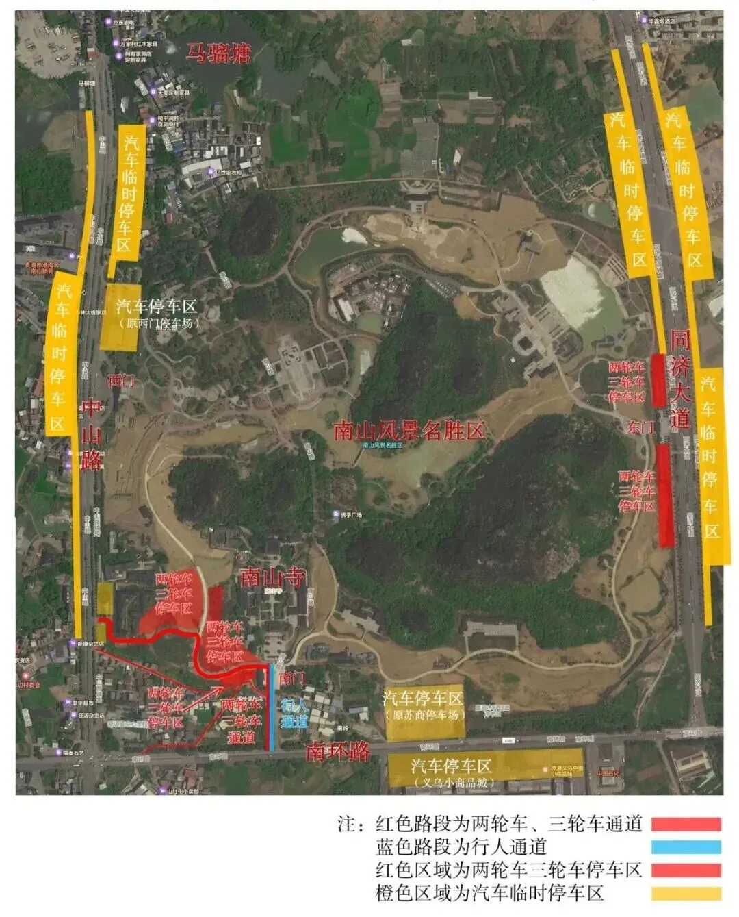 2.二轮车、三轮车停放点:东门二轮车、三轮车停车位;景区西南角新建停车位(从南山路和南环路均有入口)。