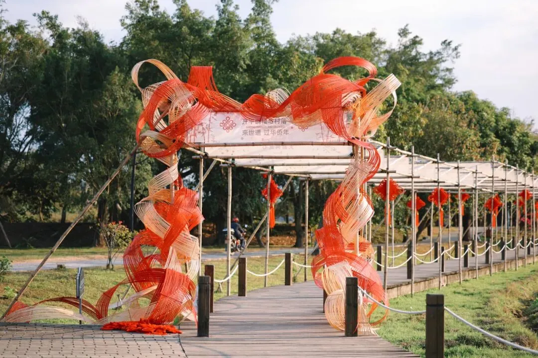 牌坊之间悬挂着巨幅“中国结”