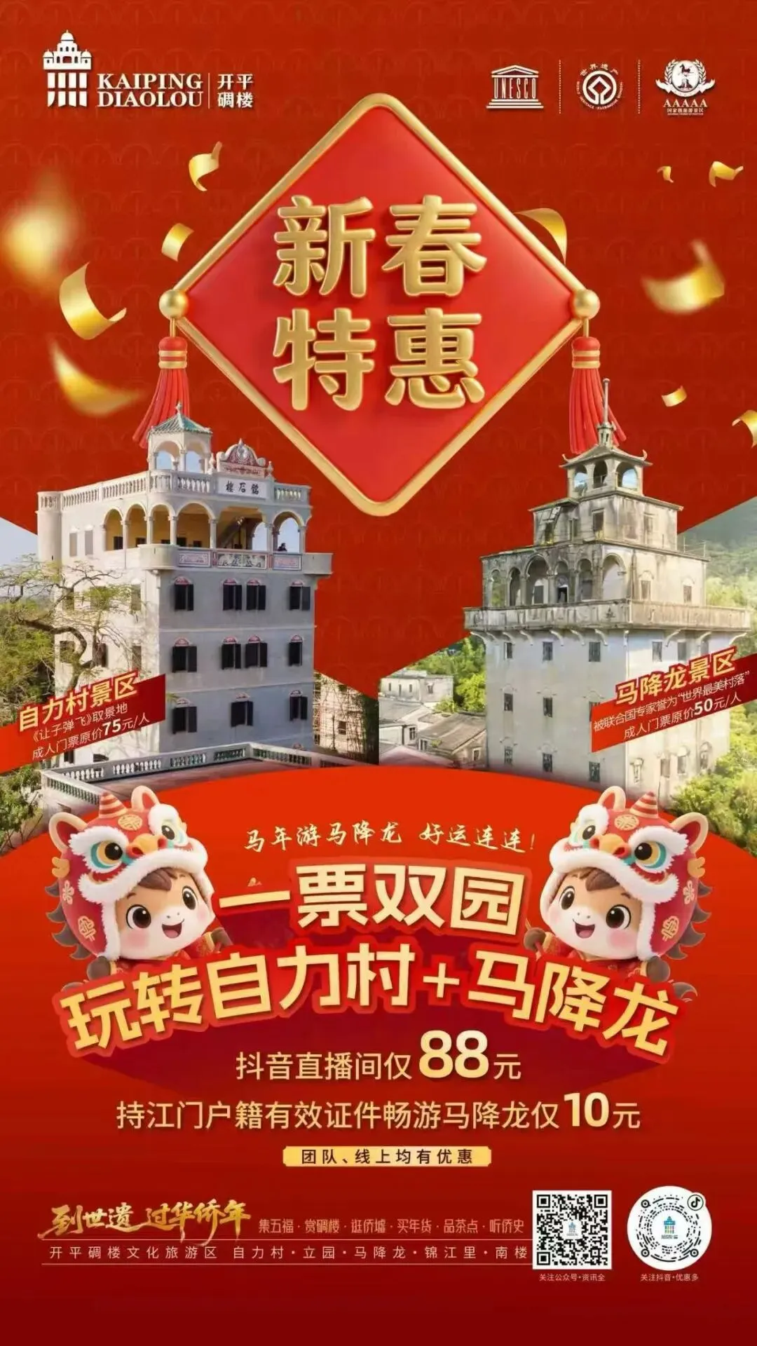 即日起至2026年2月28日,通过美团、携程、抖音等线上平台购票,江门市民专享:“马降龙单人票”仅需10元/人。