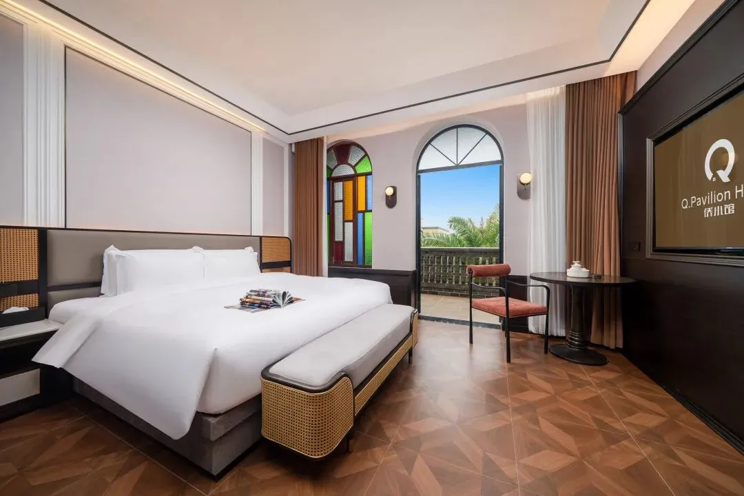 酒店以复古骑楼风格设计,彩色玻璃、庭院布局充满文化韵味,配套豪华客房、高端餐厅、文化展厅等设施,入住即开启一段沉浸式侨乡文化之旅。