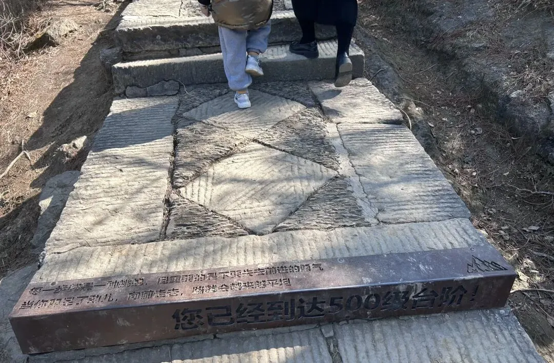 五老峰台阶大概有700级,每隔100级台阶,上面有一个铁皮提示牌,注明台阶多少级海拔多少米,最爱到台阶500级上面的那一句励志的话:“每一步都是一种挑战,但重要的是不要失去前进的勇气。当你卯足了劲儿,向前走去,路就会越来越平坦。”
