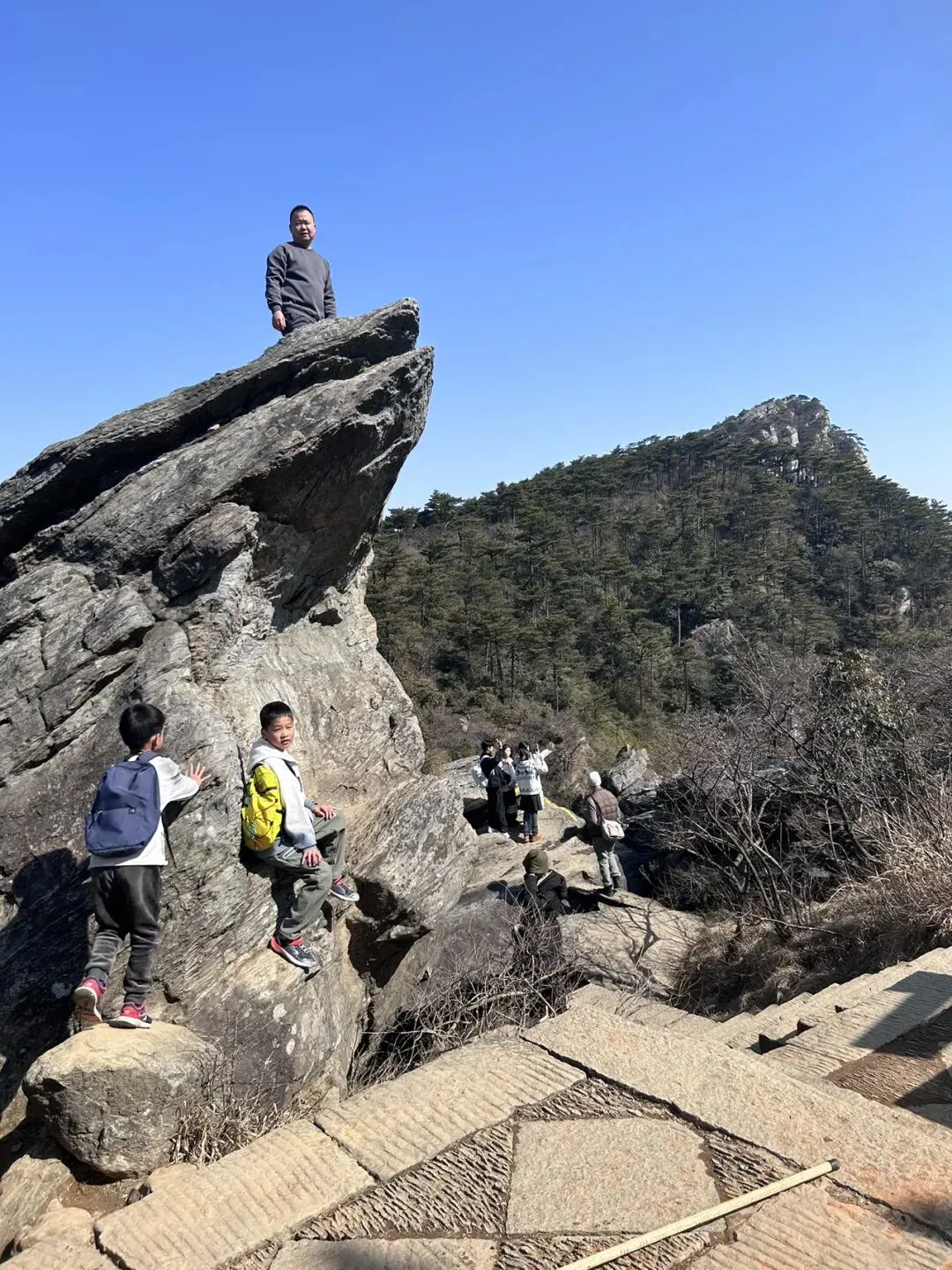 步行到三叠泉,走的山路,路上有碎石或台阶,两边是各种茂密的树木。遇到有超大石头的地方就停下来休息,孩子们在石头上蹦蹦跳跳或躺或坐饶有兴致。