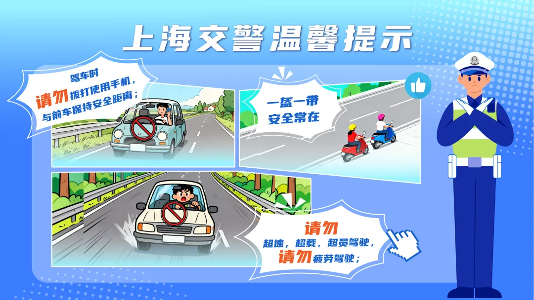 松江交警建议广大市民朋友合理选择出行时间和路线,错峰出行。自驾出游前检查好车辆,行驶过程中不要随意变道。如果高速上发生事故或特殊状况,请“车靠边、人撤离、即报警”。