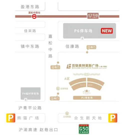 百联奥特莱斯商圈停车场包含P1(1号门)、P4(沪青平公路/嘉松中路路口西侧)、P6(佳康路北侧)、合生新天地停车场、熊猫广场停车场、元祖梦世界停车场、绿洲智谷·花园里商场停车场等。
