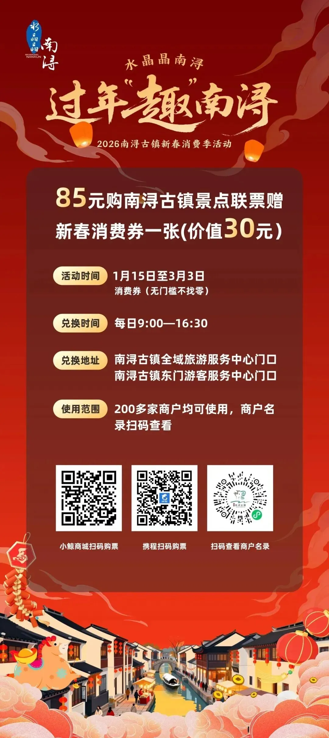 在最江南古镇的韵味中,玩冰雪、品美食、看演艺、乐享新春,还有新春消费券等你领取,一起过个热闹年!