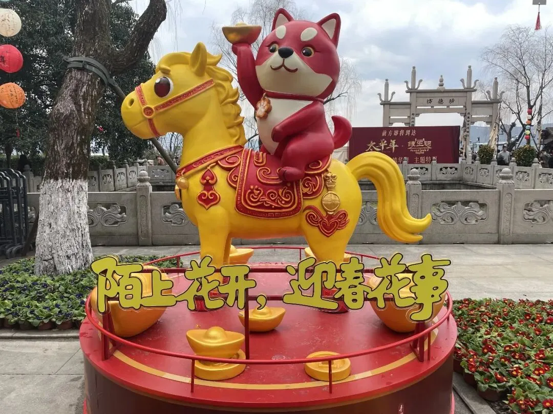 待验证入内后,其内更是精彩无限,《跃马花间》融合了剪纸、雕塑的元素,各个神采飞扬,姿态各异,装点的花卉有牡丹、郁金香、山茶等颜色喜庆的花朵,祝福满满。稍微走一点,就是《马踏丰年至》,铜马一过,五谷便熟了。紧接着就是《糖福禄糖果瀑布》与《接财神》两个小品处,带来了满满的甜蜜童话与财神好运!