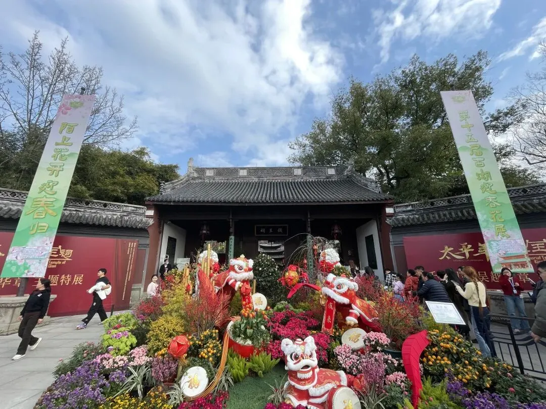 如今2026马年新春伊始,杭州钱王祠氛围浪漫拉满,三重浪“金身”加持,一重为第十五届西湖迎春花展开幕,以“花团锦簇·春风策马太平年”为主题;二重为电视剧《太平年》布展,可追忆吴越国历史记忆;三重为红墙梅花完美呈现,芳香四溢。可以说,来一趟杭州钱王祠,可观梅、赏花、探古,并带走好运!
