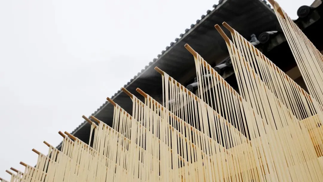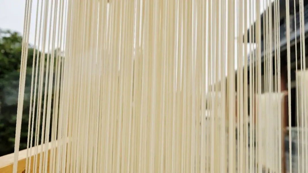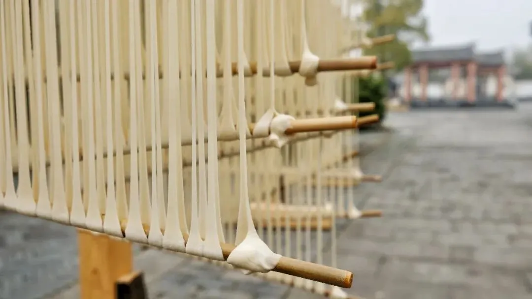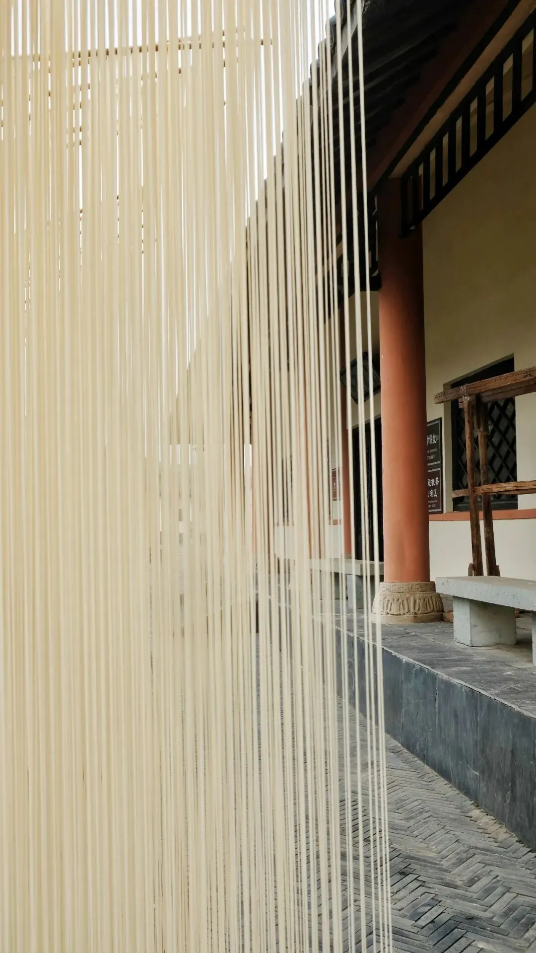 走着走着空气里飘来湿湿的、甜甜的面条香味儿,走近才看到木架上整齐晒着一排排的手工挂面,在风里微微飘动,像琴弦一般,竟成了景区里最生动的存在。