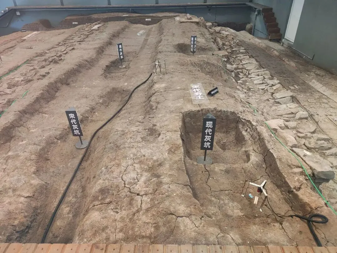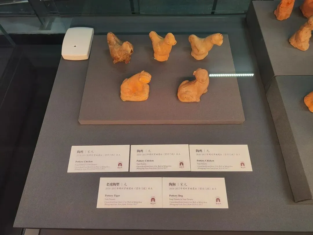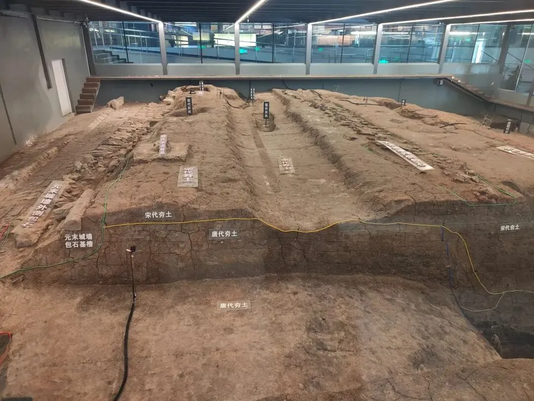 “城墙复现”部分是展览的核心,分为“从文献到发现——望京门段罗城考古”和“从保护到展示——望京门遗址公园建设”两个单元。此处不仅通过丰富的图片、文献与沙盘立体呈现宁波城防史,更以一处精心设计的特质玻璃罩,完整保护并展示了考古揭露出的城墙实物遗址。该遗址长18米,宽16.5米,面积近300平方米,清晰地呈现出由生土层、六朝地层、唐末瓦砾层至南宋城墙外侧护坡的连续地层堆积,是解读宁波古城建造与演变过程的直接物证。同时,考古出土的越窑、龙泉窑等全国各地窑口的瓷器,以及砖瓦、陶器、铜钱等文物也在此区域分类展出。