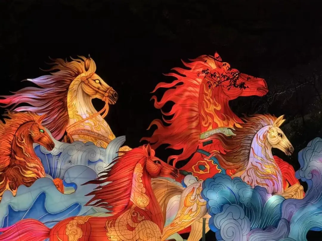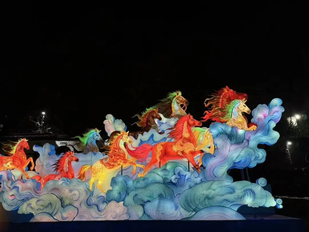 高达12米的灯组,以九匹姿态各异的骏马为核心,运用动态光电技术呈现,骏马自浪花中奔腾而出。好似幻化为龙腾跃升空的超现实意境,既彰显马年奋进生机、又暗藏美好寓意。