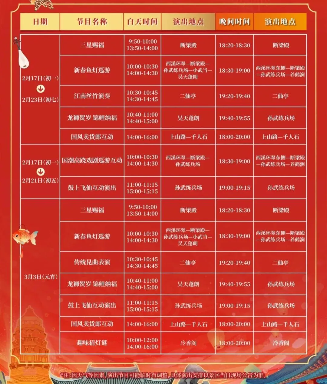 夜间重点活动则集中在断梁殿、孙武练兵场区域,以声、光、艺重现传统年节欢腾场面。