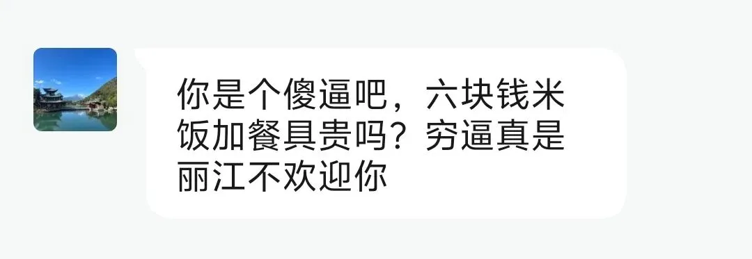点开详情一看,好家伙原来是某些旅游从业人员,急了? 丽江的黑心商家和导游真的蛇鼠一窝? 怪不得某些游客在网上说丽江有宰客的? 我来丽江没几天,就遇到两次? 还有一次区爬山,打车区山腰上的寺庙处,滴滴司机接单了,到了位置接我,让我加100元返程费才能送我?我拒绝后下车,果断投诉了。。。还好又打了一辆,没有加钱。 总有一些坏了良心的商家,恶心我们的市场。 我是较真了,怎么了? 米饭3元,收费餐具1元,她多收我钱,我就不同意怎么着了? 就你们某些黑心从业人员还“品质游云南”?就这态度? 我就较真了,你们(黑心从业人员)怎么着吧?