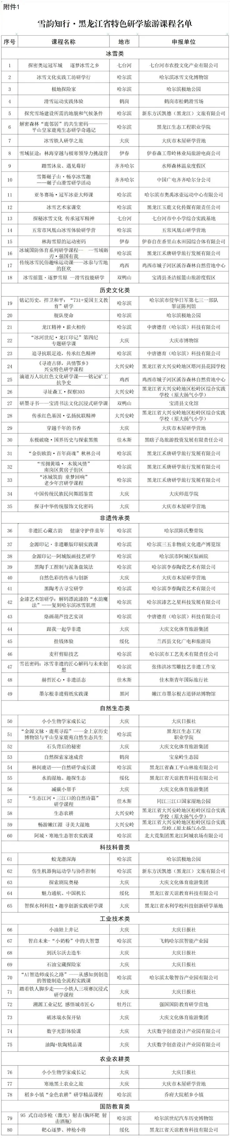 近日黑龙江省文化和旅游厅,发布了关于首批“雪韵知行·黑龙江省特色研学旅游课程”的公示,共80堂课程入选。公示期3个工作日,期间接受反馈。公示内容应实事求是,并提供相应材料。