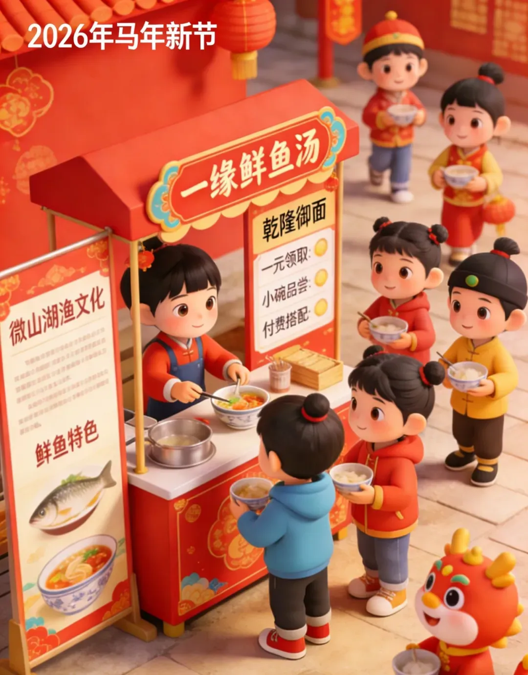 活动内容:一碗鱼汤品湖韵,一元开启渔乡情。特制小碗盛满现熬的微山湖鲜鱼汤,佐以渔文化展板讲解,让滋味与故事一同入心。更可升级品尝传奇“乾隆御面”,从舌尖走进历史。