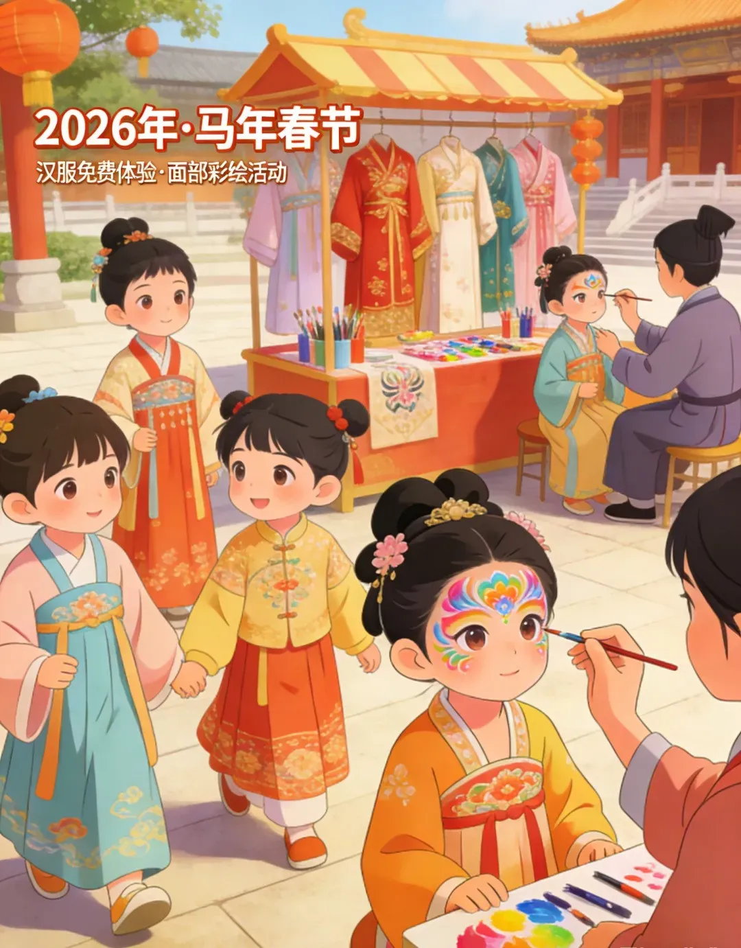 活动内容:景区免费提供多款精美汉服供您选择穿戴与拍照留念。若想令造型更为出彩,可超值升级专业面部彩绘服务,由画师为您量身描绘精致花钿或祥云图案,瞬间点亮古典气质,助您在专属古风场景中定格绝美瞬间。