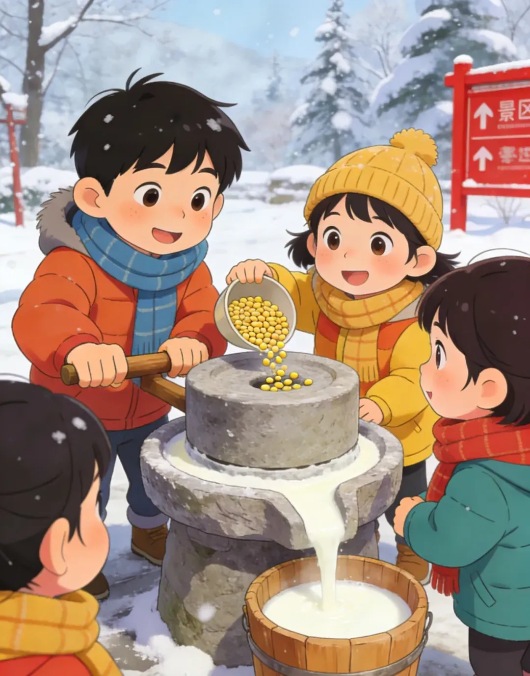 2.儿童磨豆浆体验:景区提供儿童石磨和豆子,游客可付费体验。