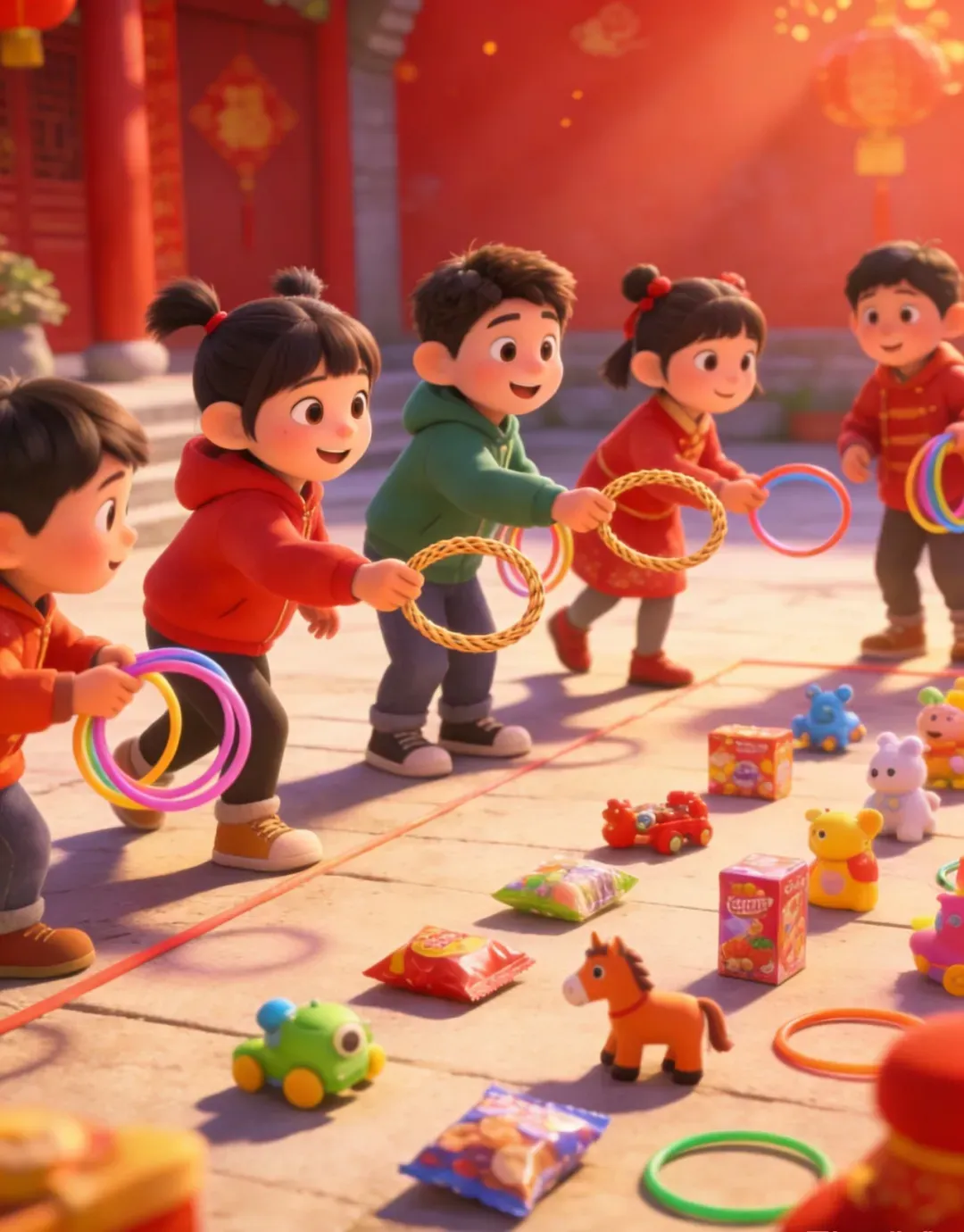 3.套圈:来玩经典套圈游戏!用塑料或藤圈瞄准投掷,将心仪的玩具零食套中带回家。