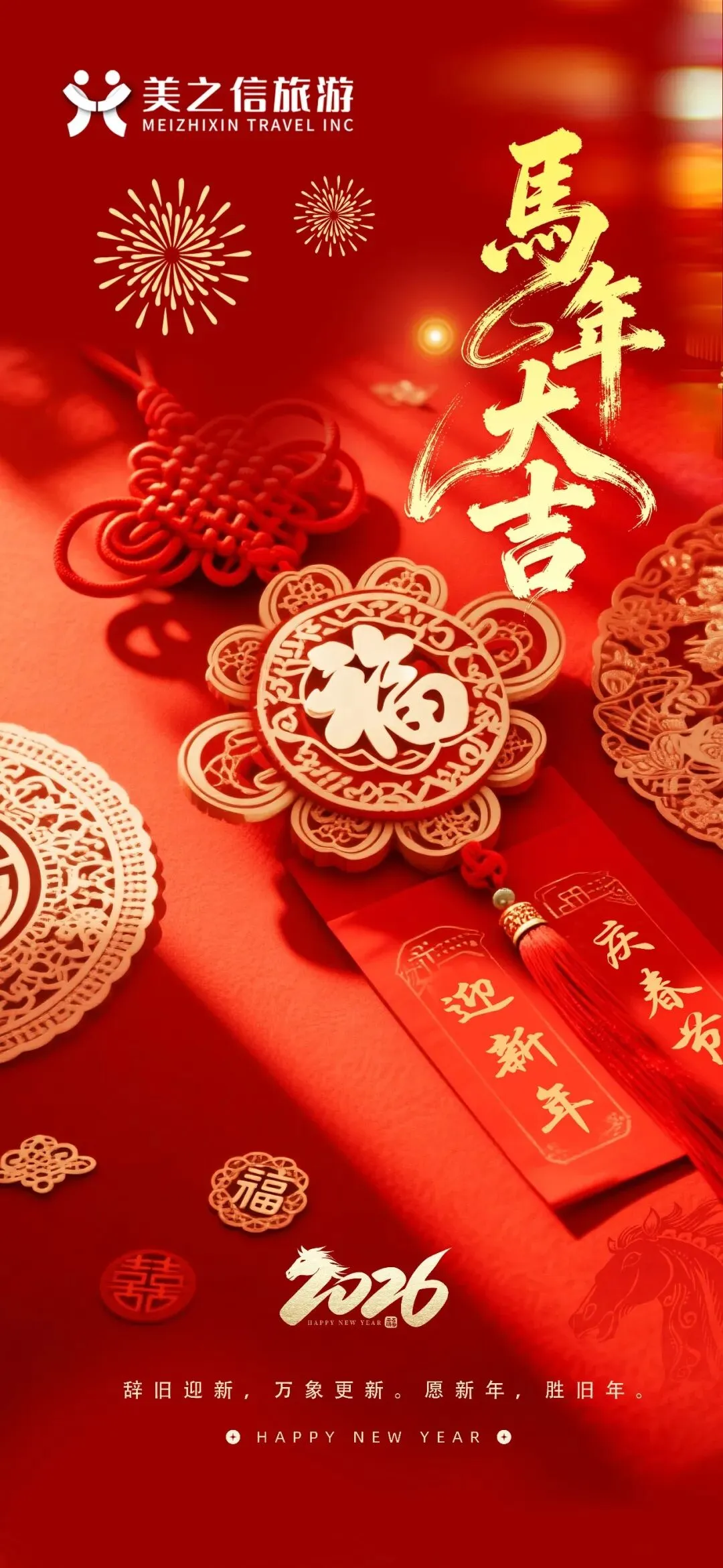 时光流转,万象更新。值此农历马年新春之际,美之信旅游对各位客户长期以来的支持表示诚挚谢意。美之信旅游全体员工恭祝您:新春快乐,马年大吉,阖家幸福,万事如意!