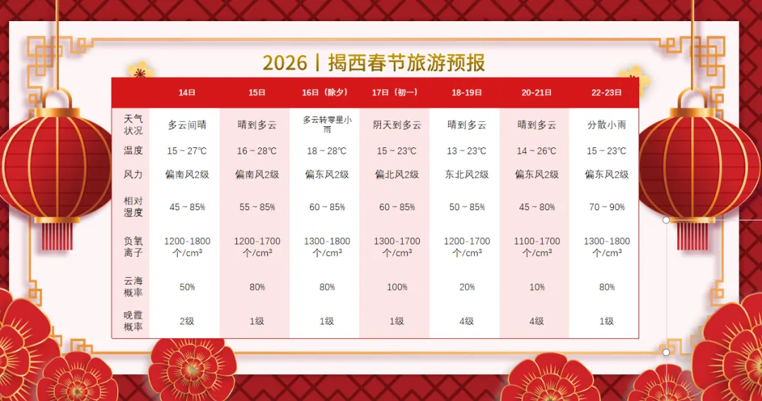 为了让您的春节假期更加安心愉快,我们将持续关注春节期间气象变化,为广大市民和游客提供及时准确的服务支持,让您在揭西享受一个安全、舒心、难忘的生态旅游假期。