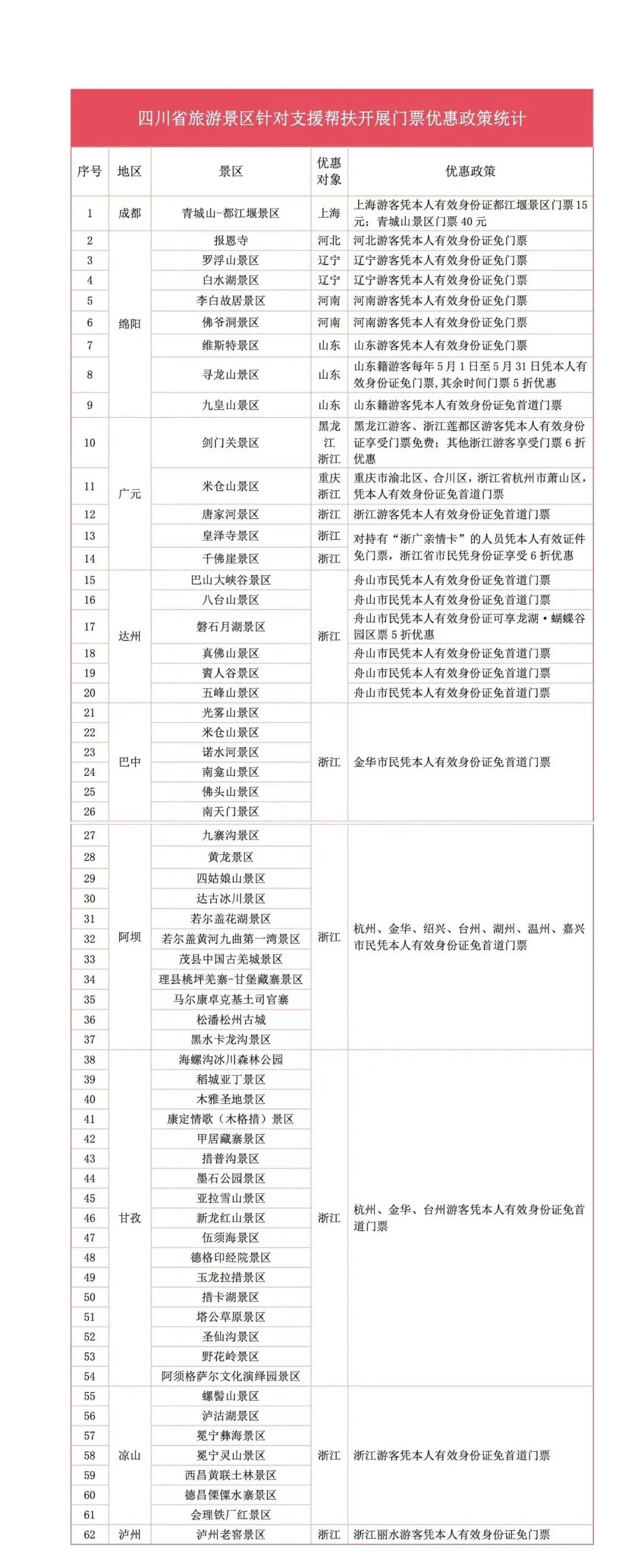 一省帮一县,恩情重如山,汶川特大地震后,举国千里驰援,与四川风雨同舟、并肩奋战。十八载春秋流转,巴蜀涅槃重生。援建恩情永不忘,四川记心上,免票或优惠票价政策正是真诚和质朴的感恩回馈。