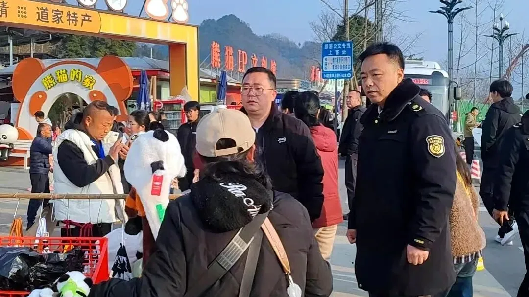 2月14日,记者在都江堰熊猫谷景区入口处看到,联合执法组正开展黑导游专项整治。执法人员身着制服、佩戴执法记录仪,对上前搭讪揽客、无正规证件的人员逐一拦查核验,现场核对电子导游证、团队行程单与旅行社委派手续。并向围观游客讲解辨别黑导游、防范消费陷阱的提示。周边巡查组同步巡逻,对尾随揽客、散发违规小广告、诱导购物等行为即时制止。