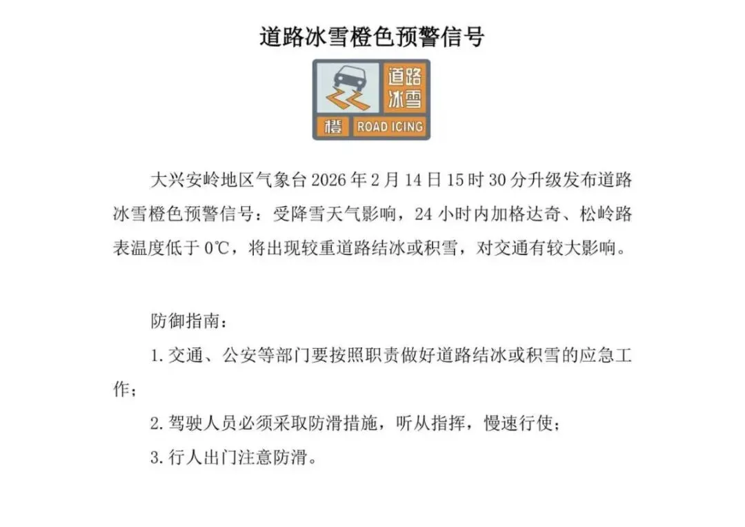 【旅游交通提示】道路冰雪橙色预警,加格达奇、松岭24小时内交通受较大影响,出行务必注意!