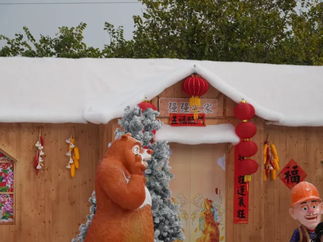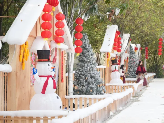 童话雪乡完美还原了梦幻雪国风貌,成片的“积雪”蓬松柔软如棉花糖,覆盖着原木搭建的小木屋,屋顶的“雪蘑菇”圆润可爱,搭配红彤彤的灯笼点缀,风一吹灯笼轻轻晃动,暖光映着“白雪”,瞬间氛围感拉满。