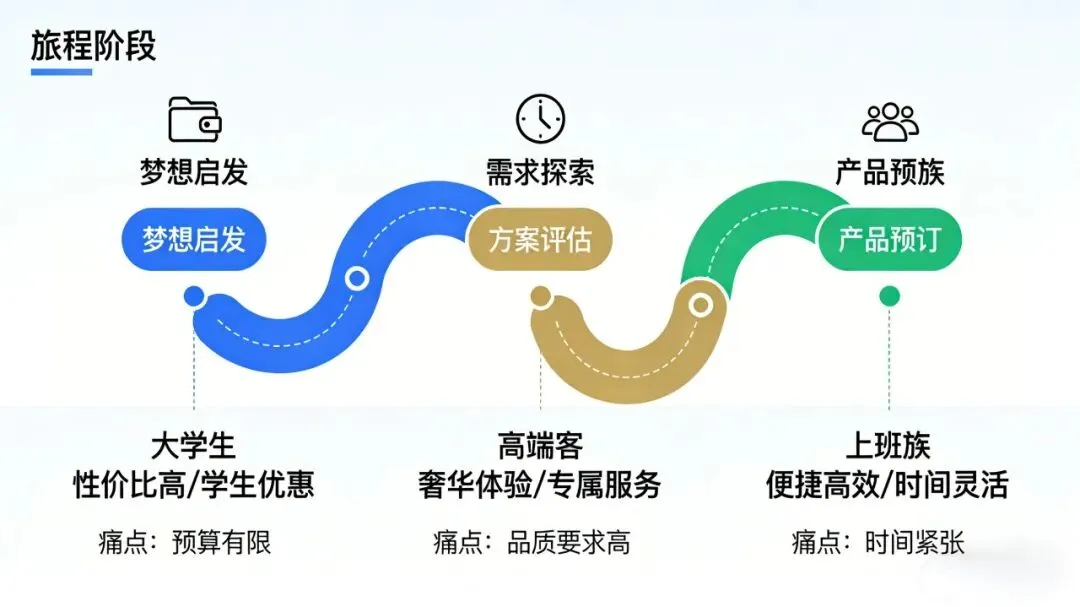 旅程阶段 | 大学生(性价比导向) | 高端度假客(品质/独特导向) | 上班族(便捷/治愈导向) |
