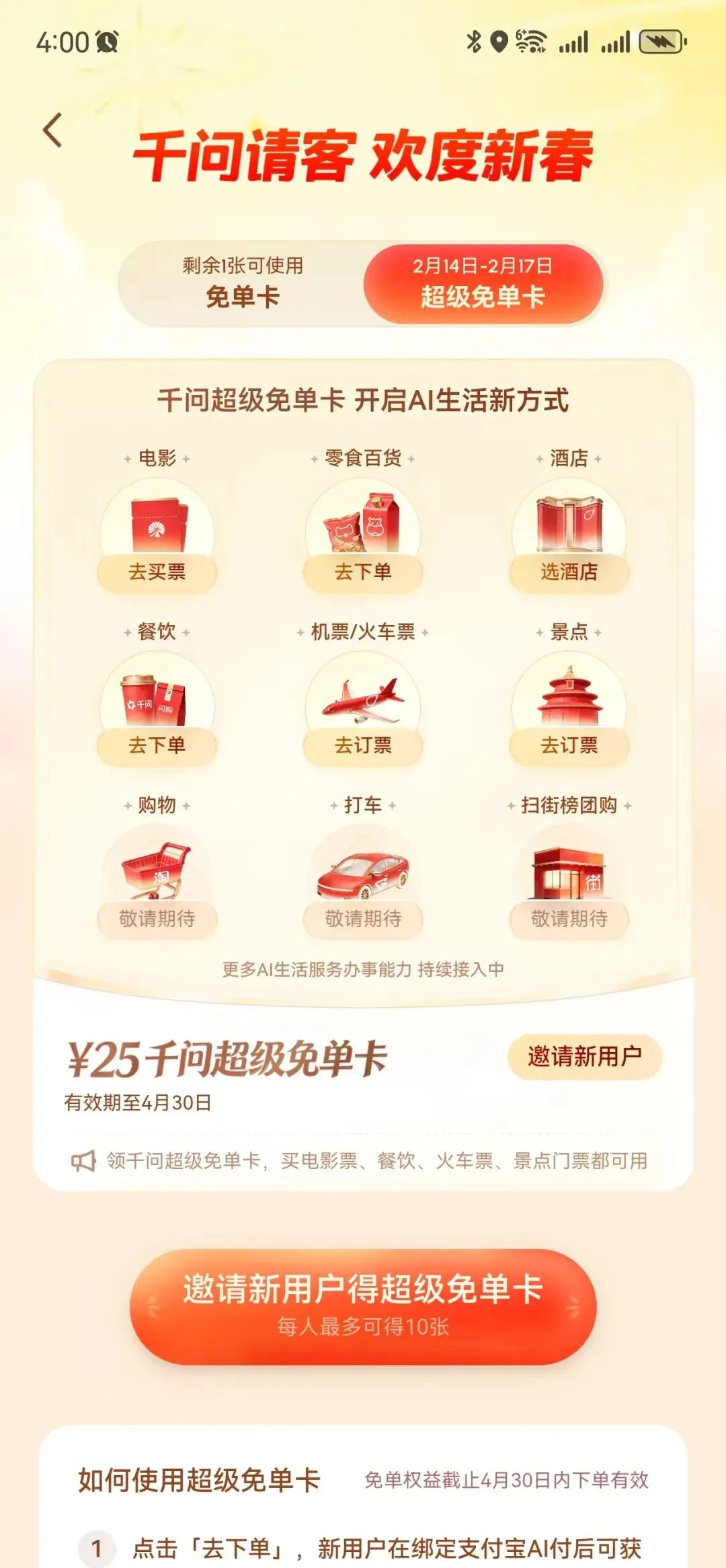 对了,如果你是还没下载过千问的新用户,那就偷着乐吧。新用户直接送一张25元超级免单卡 。老用户也别急,去拉个新朋友,你俩各得一张,最多能拿10张 。