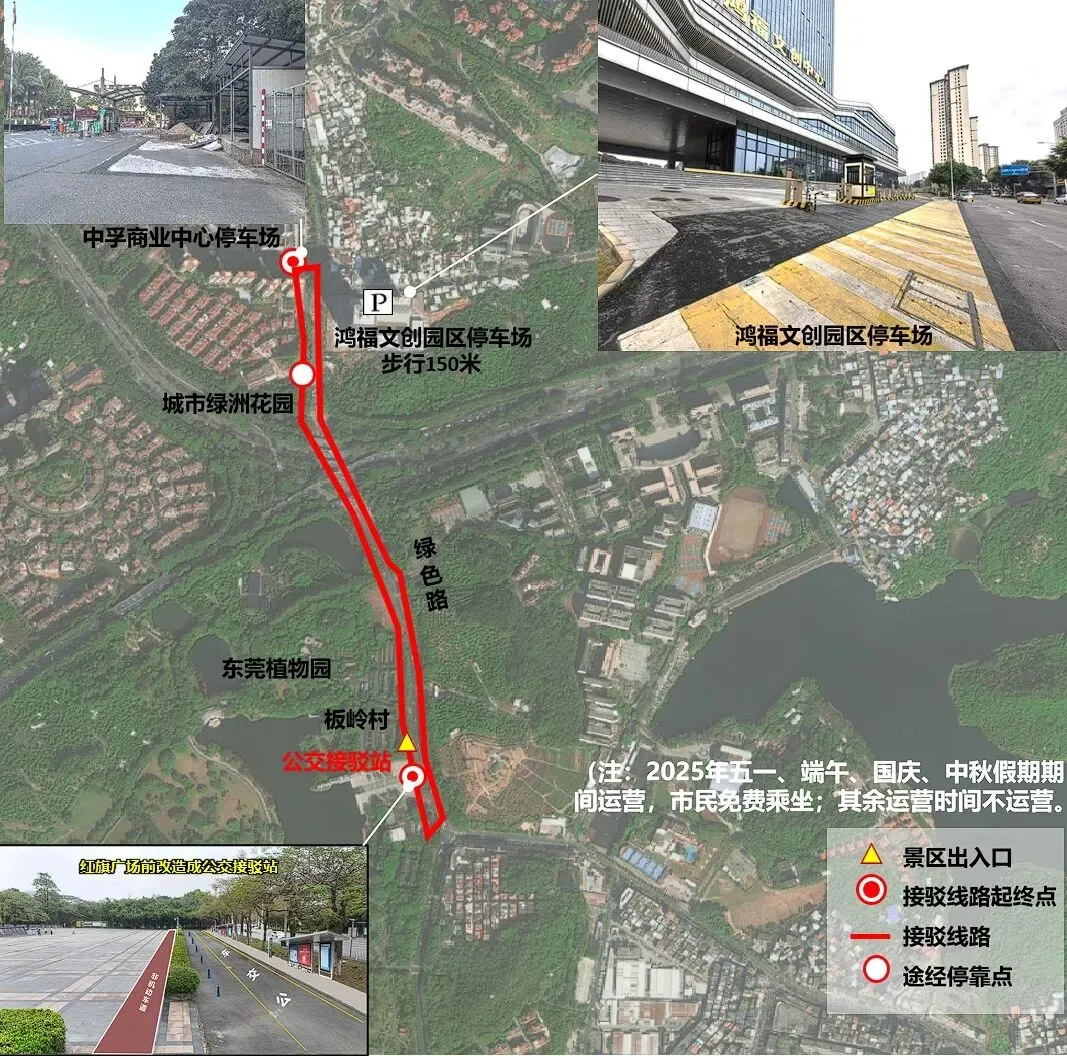 东莞植物园新增4条轨道商圈假日专线,为响应式公交,全程采用招手即停的运营方式,市民可免费乘坐。