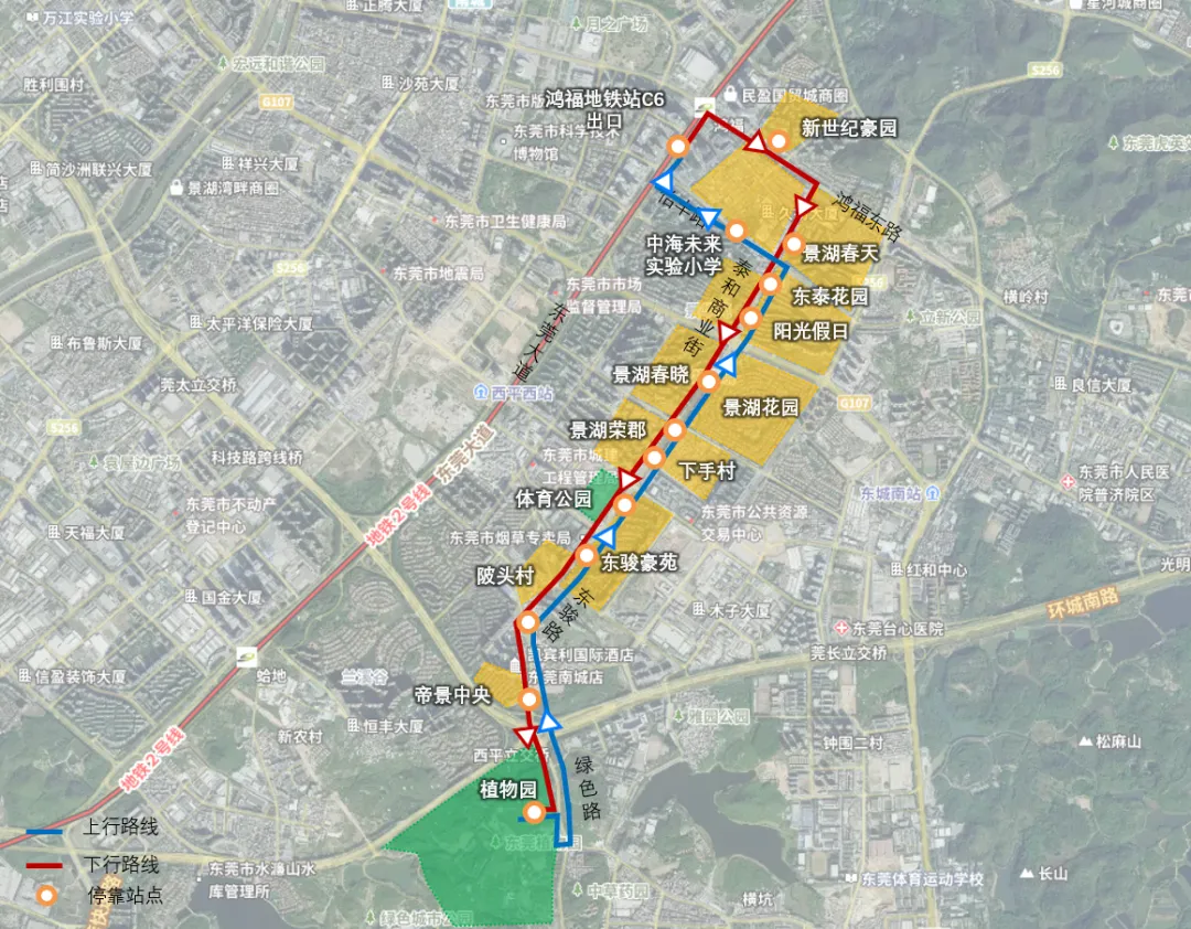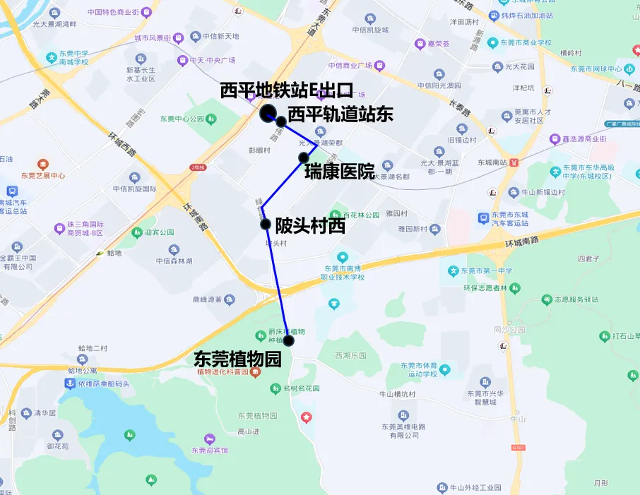 专线停靠“西平地铁站E出口、西平轨道站东、瑞康医院(思朗广场)、陂头村西、东莞植物园”站。