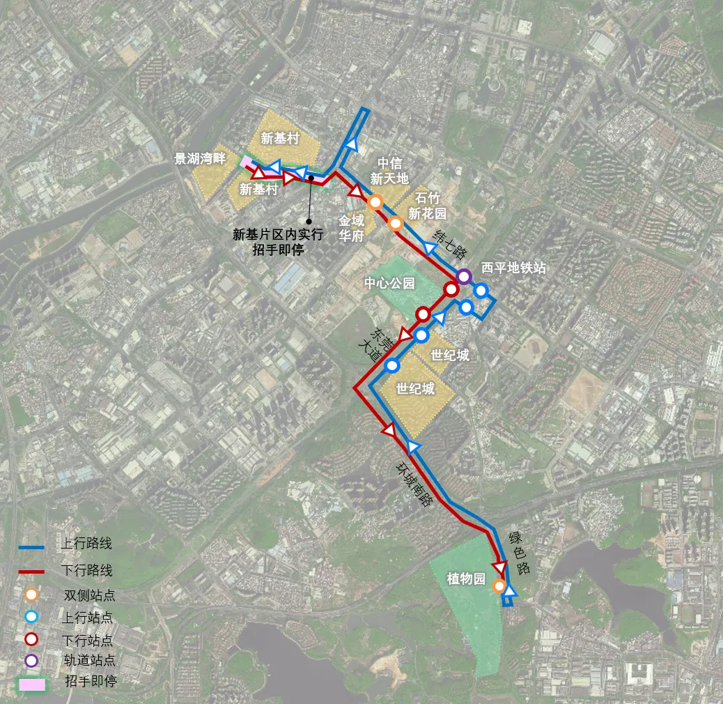 以新基市场为起讫点,线路途经新基路、纬七路、东莞大道、环城南路、绿色路等道路,串联沿线居住片区与植物园。