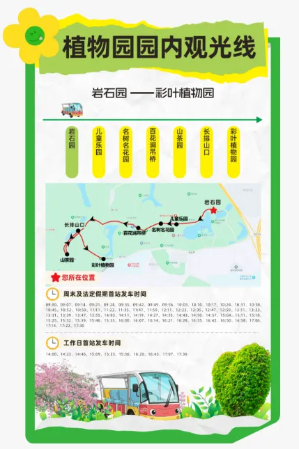 停靠站点:岩石园、儿童乐园、名树名花园、百花涧吊桥、山茶园、长排山口、彩叶植物园
