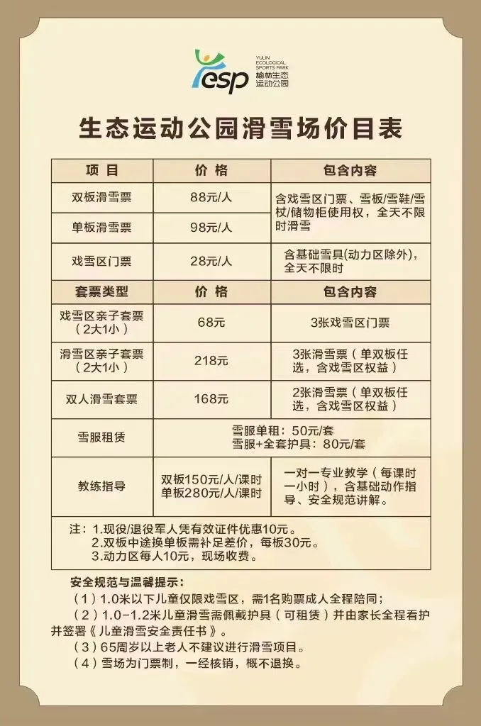 💛玩点:戏雪狂欢地!特设趣味戏雪乐园,雪地摩托、滑雪圈、无动力小摩托等多元化项目满足全家人需求。还有专业滑雪教学优惠,教练一对一指导。别忘了叠加使用榆林冰雪消费券,性价比超高,快来感受酣畅淋漓的雪趣!