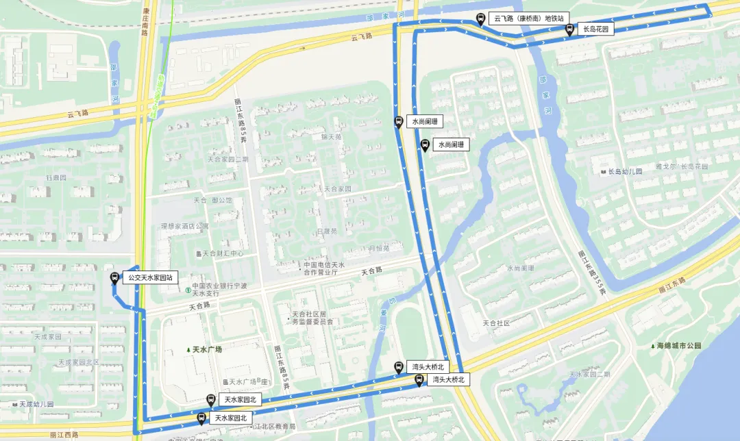 站点设置:公交天水家园站、天水家园北(丽江路地铁站)、湾头大桥北、水尚阑珊【云飞路(康桥南)地铁站】、长岛花园(注:位于云飞路)、云飞路(康桥南)地铁站、水尚阑珊【云飞路(康桥南)地铁站】、湾头大桥北、天水家园北(丽江路地铁站)、公交天水家园站