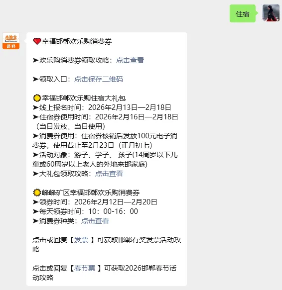 2026年2月16日-2月18日期间,每日10:00-18:00限量发放(每日10000张,共计30000张)住宿电子券,发完即止。活动期间每位消费者仅可领取一张住宿券,当日有效。