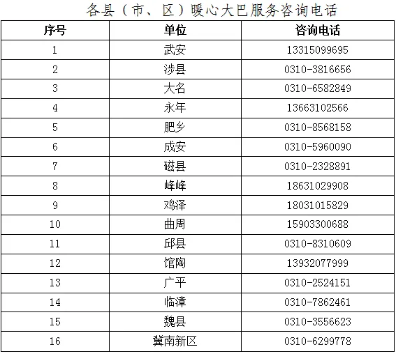 每天8:00-20:00,在邯郸东站(汽车客运中心站)、邯郸火车站(汽车客运总站)、邯郸机场设立暖心大巴接待接驳站。返乡游子凭当日返邯火车票、机票、长途汽车票和有效身份证件即可免费乘坐。