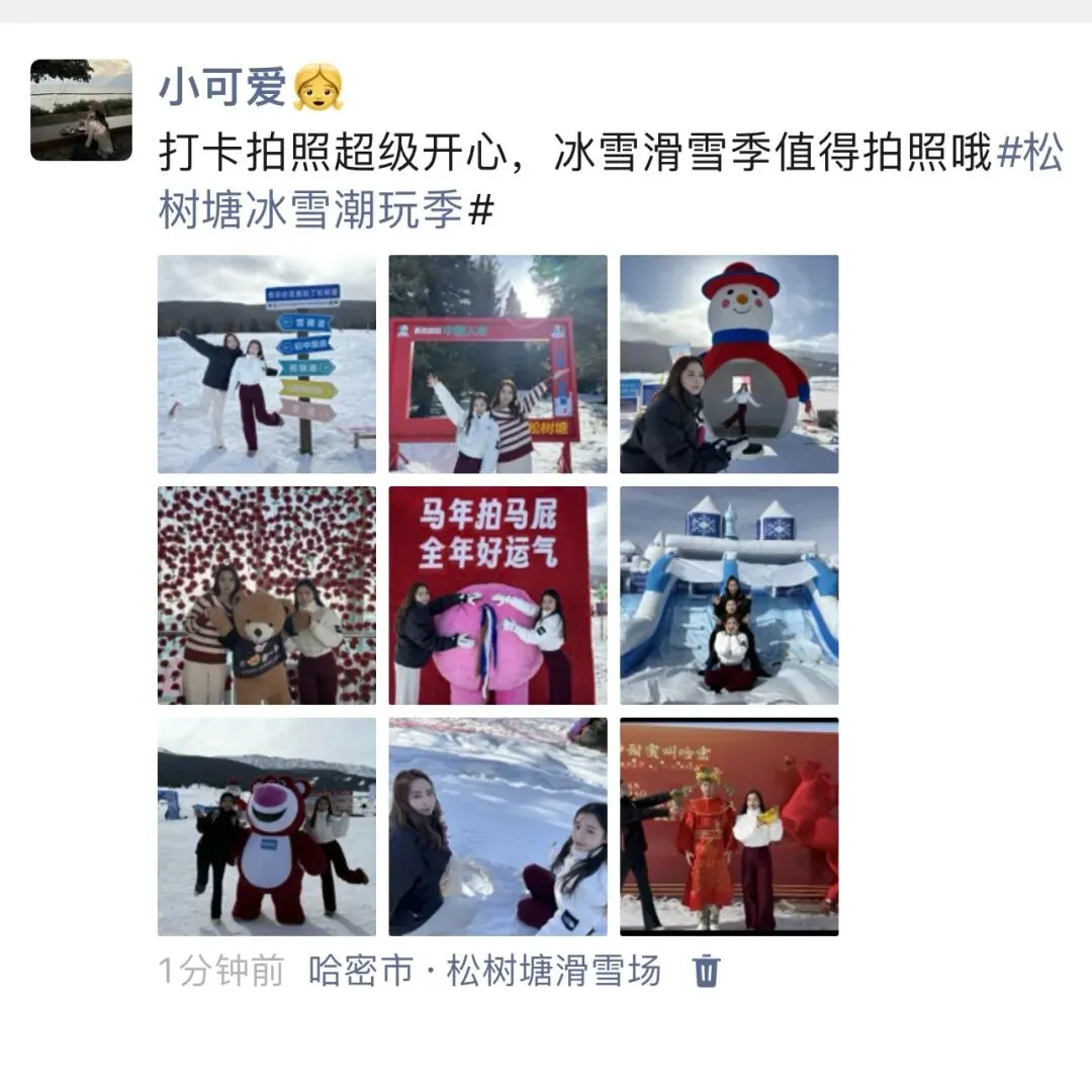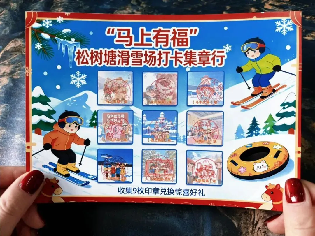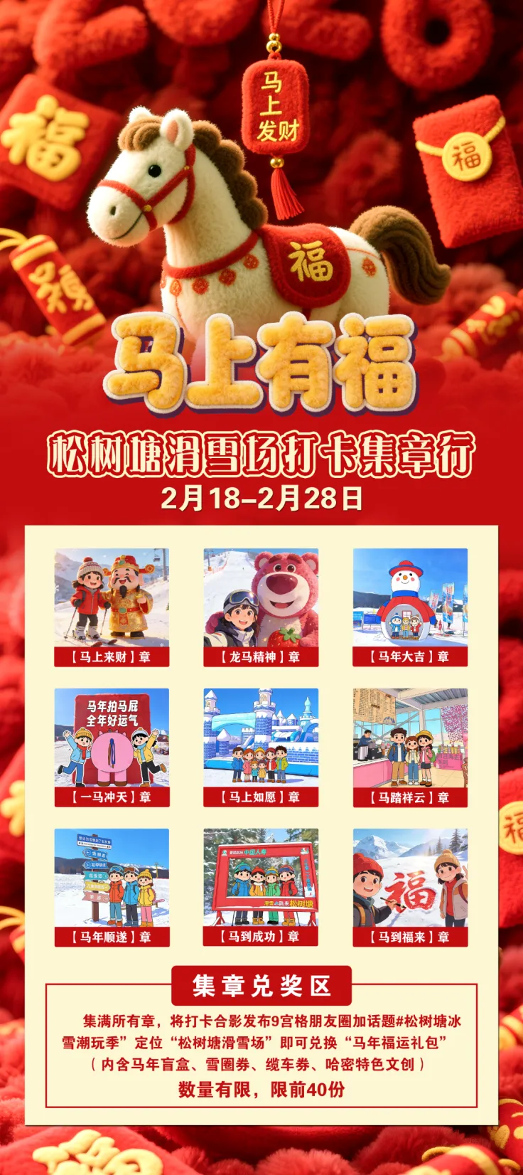 集齐所有9枚印章,即可解锁重磅福利!将你的打卡合影整理成9宫格,发布朋友圈并添加话题 #松树塘冰雪潮玩季#,定位「松树塘滑雪场」,就能兑换「马年福运礼包」一份!