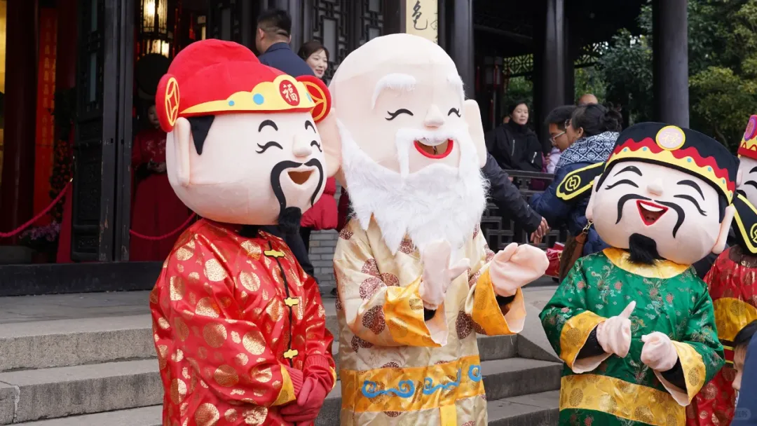 财神+福禄寿+马年卡通玩偶组成的NPC巡游队伍,会沿着登山主干道、庙街、游客中心一路派福!