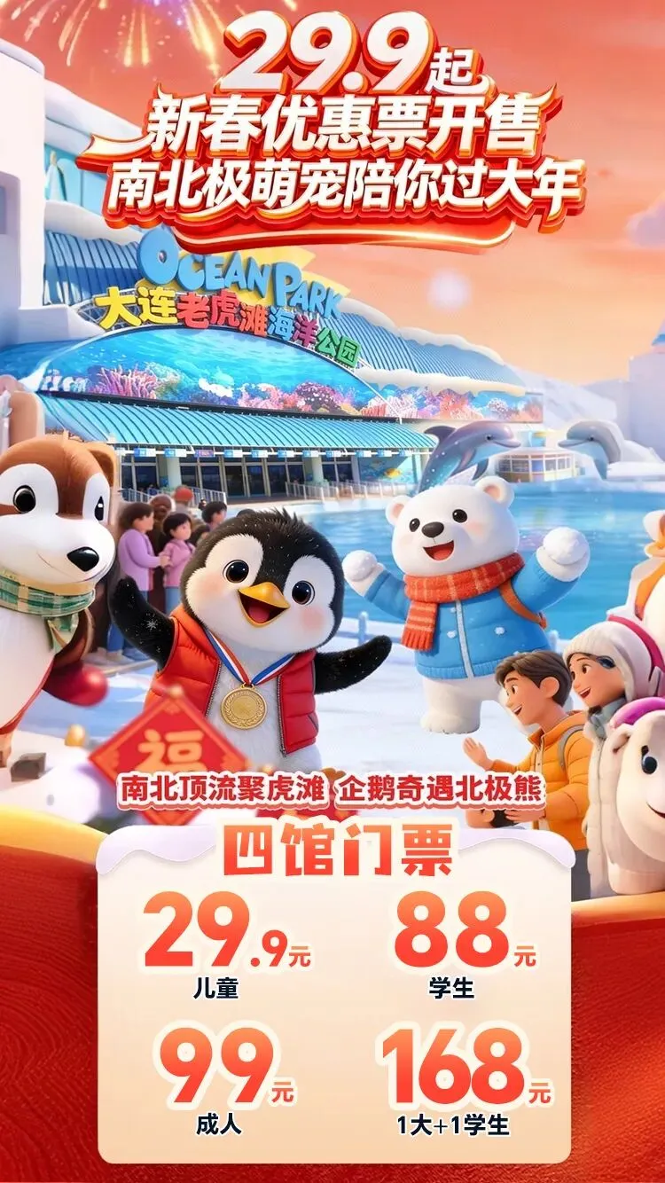 白鲸与海豚的动人舞姿融入新春元素,浪漫的人鱼表演重返神秘海境,萌宠大巡游马力全开,海底音乐会焕新升级!更有节日氛围的表演。珊瑚馆、海兽馆、鸟语林、马驷骥根艺美术陈列馆年味不断,热闹非凡的极地海洋春节,就在大连老虎滩海洋公园!