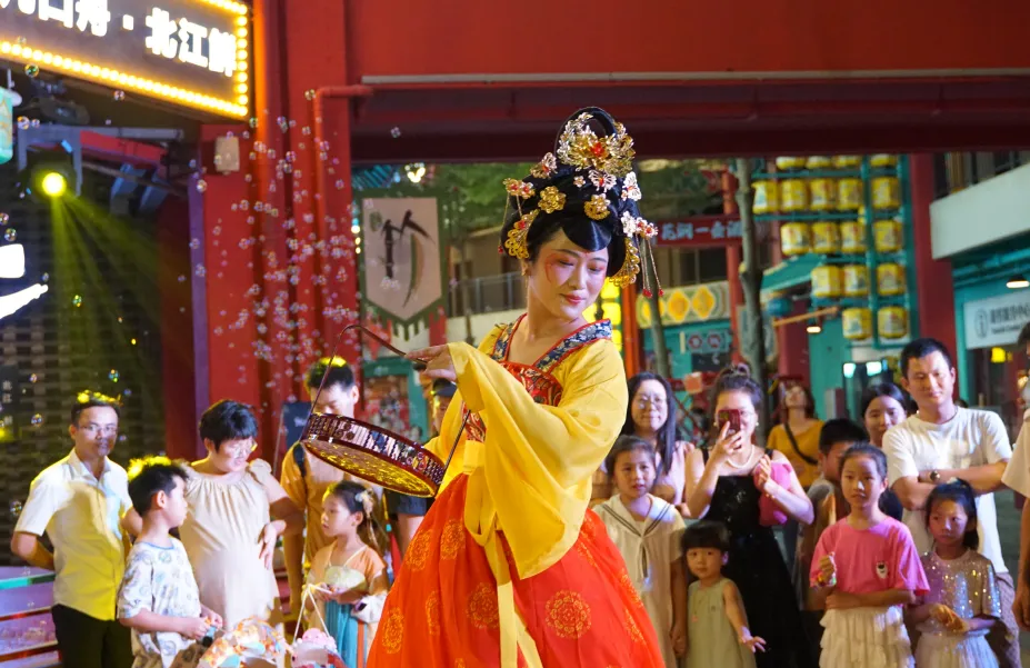 长安古乐、大唐不倒翁、国粹变脸、唐代百戏等精彩唐风演艺,每天在18:00-22:00轮番上演,让人看得相当过瘾。