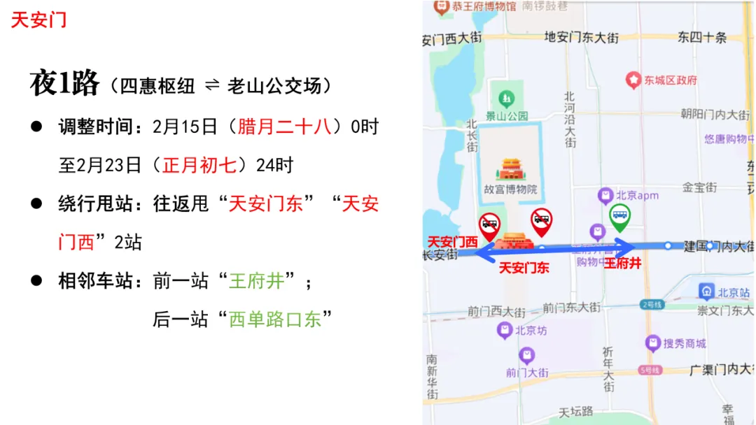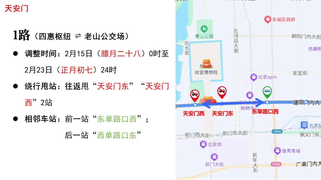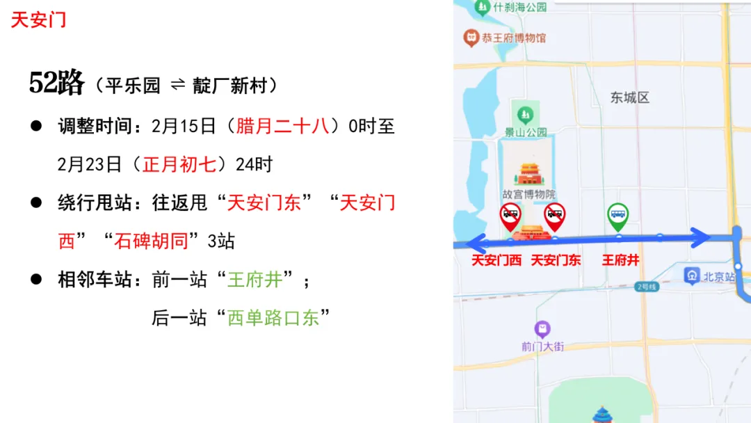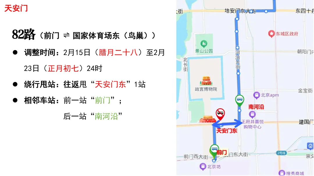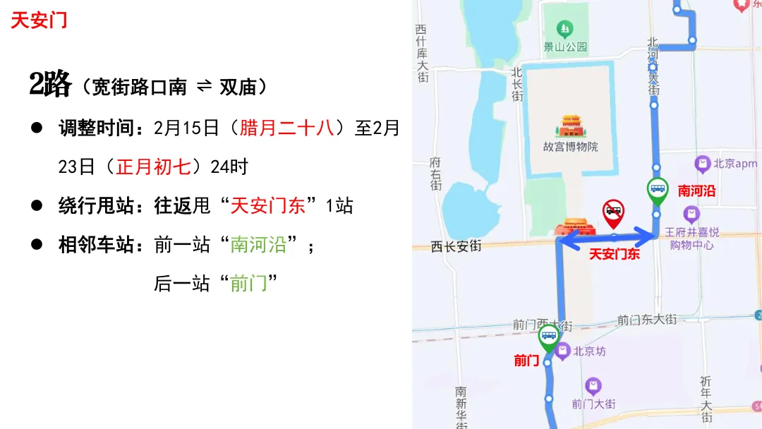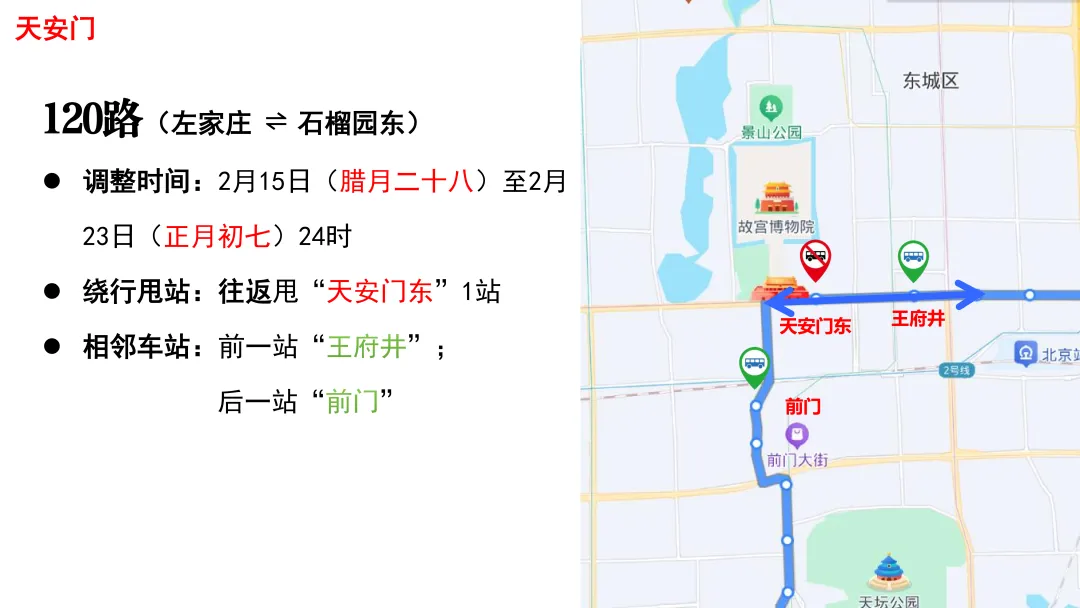1.2月15日(腊月廿八)至2月23日(正月初七)期间,地铁前门站A口全天封闭,地铁天安门东D口每日首班车至15时封闭。