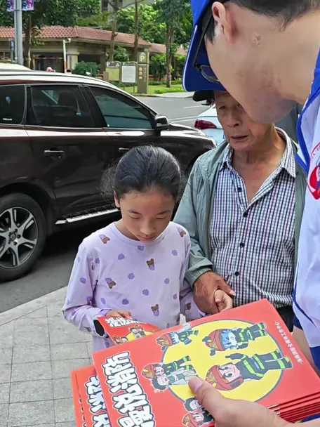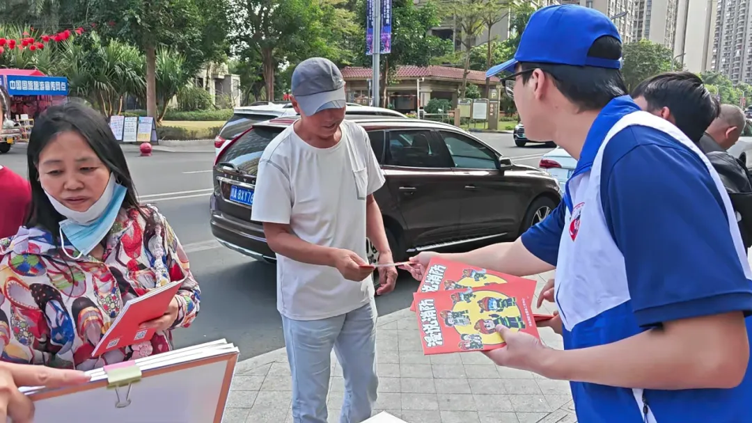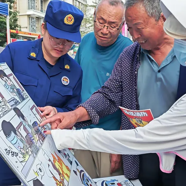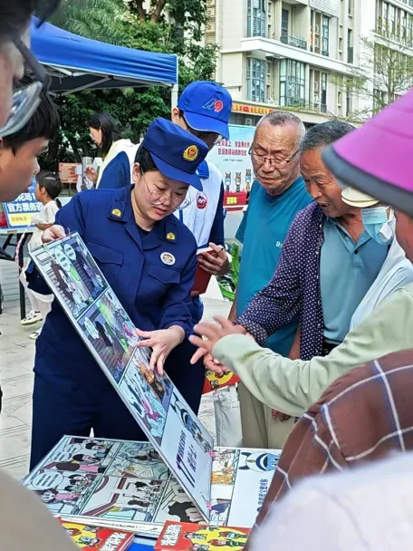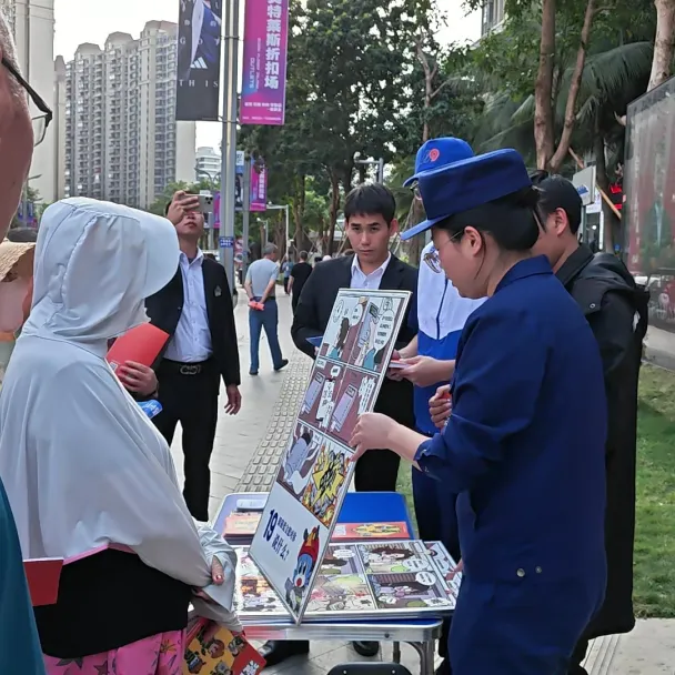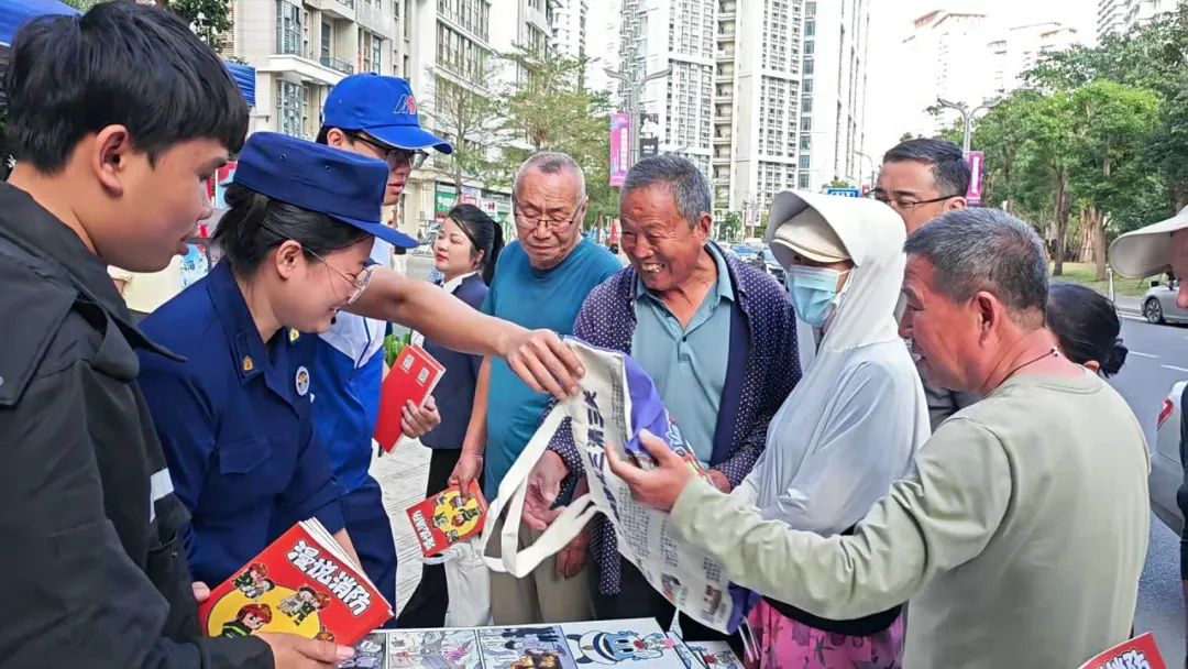 活动现场,消防宣讲员将灭火器使用、电动自行车规范充电、酒店民宿防火等安全常识,以及《中华人民共和国消防法》《海南自由贸易港消防条例》中与游客、商户密切相关的内容,融入趣味问答题目。参与者随机抽题作答,答对即可获得消防主题文创礼品。志愿者与物业人员穿梭在人群中,协助发放宣传资料、引导群众参与答题,物业人员还结合日常管理经验,向游客讲解景区防火注意事项。摊位前人头攒动,不少游客边学边答,在轻松氛围中掌握逃生技能与法律知识。