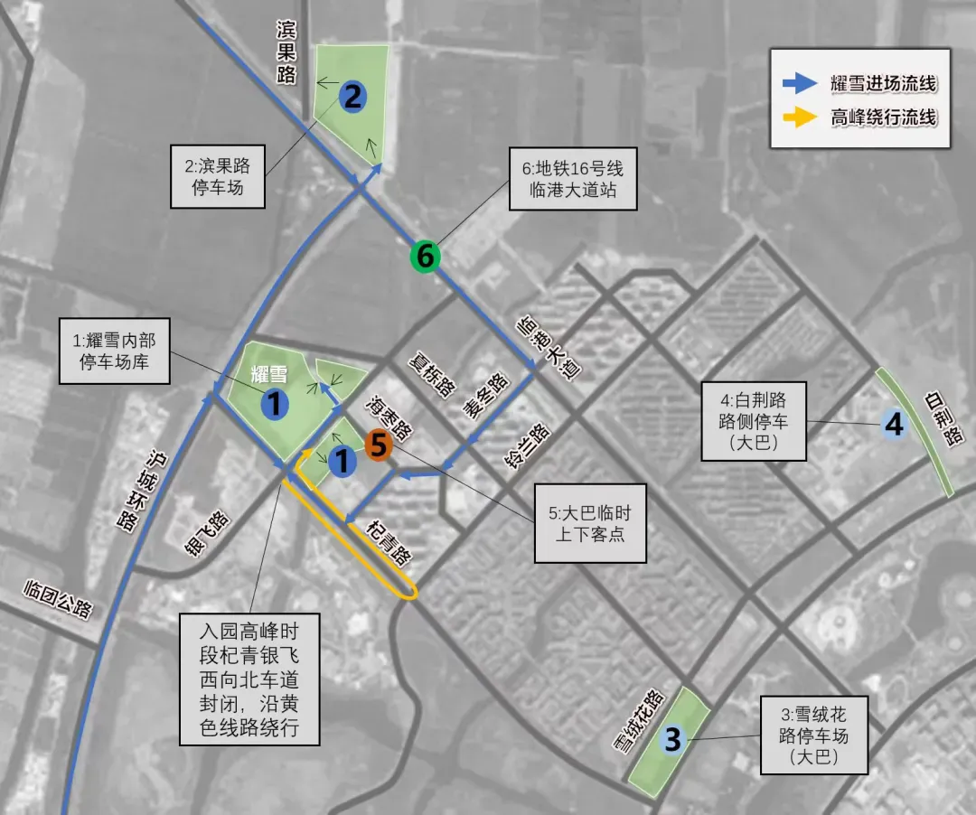 线路①:临港大道—沪城环路—杞青路—银飞路—银飞路海枣路交叉口左转—耀雪内部停车场进口