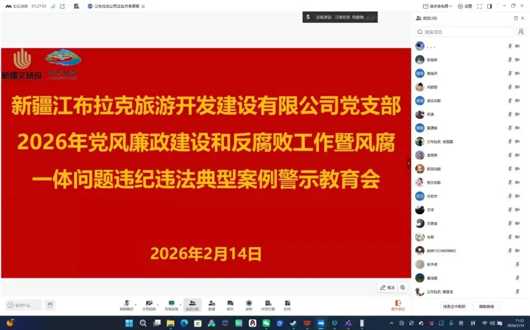 2月14日,新疆江布拉克旅游开发建设有限公司召开2026年党风廉政建设和反腐败工作暨风腐一体问题违纪违法典型案例警示教育会,公司全体人员参加,会议由公司党支部书记、董事长武培峰主持。