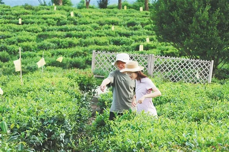 游客在新伟茶园了解茶叶。夏小英 摄