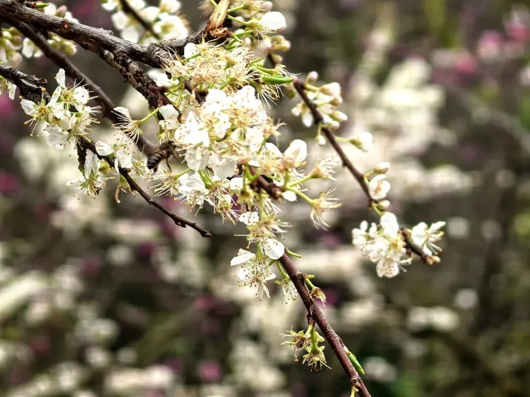 走进春花岛,连片的李花在枝头竞相绽放,五瓣洁白的花瓣簇拥着嫩黄的花蕊,微风拂过,花枝轻颤,清香浮动。不少市民身着传统服饰,在花树下摆起造型,用手机、相机记录下他们与“雪海”的邂逅;还有摄影爱好者架起设备,捕捉蜜蜂穿梭花间的灵动瞬间,整个春花岛洋溢着春日的生机与活力。