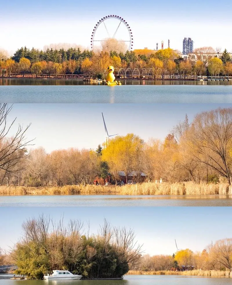 园子里有几个人工湖,冬天水面会结冰,冰面上经常能看到野鸭子站着晒太阳,有时候冰层不够厚,鸭子踩上去还会打滑,挺有意思的。湖边有长廊和亭子,冬天坐在那儿晒太阳特别舒服,周围一个人没有,能听见风吹过树梢的声音,偶尔有喜鹊叫两声,那股子清净劲儿是城里找不到的。