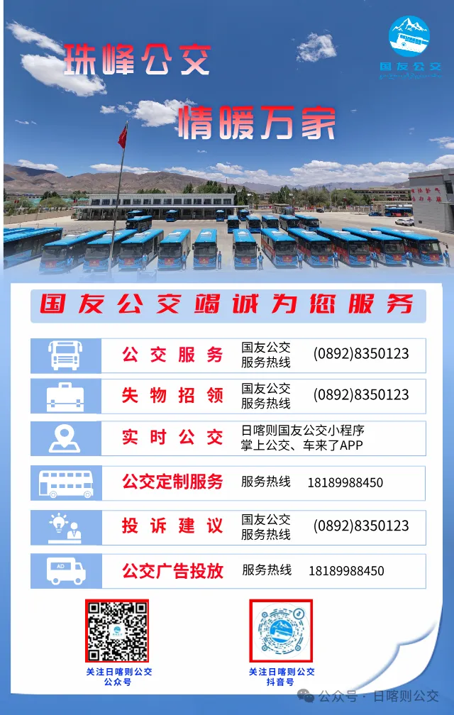 请广大市民朋友相互转告,提前做好出行安排,更多出行服务请关注“日喀则国友公交”微信公众号,随时随地查询公交实时信息。公交服务咨询电话:0892-8350123。