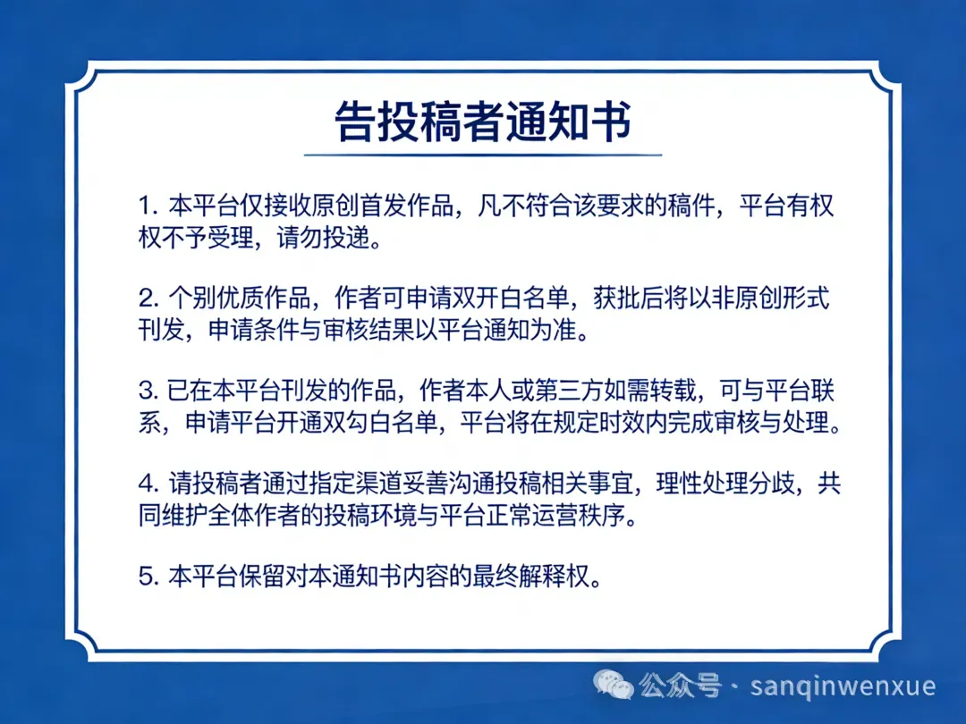 1、作品必须原创首发,投稿即默认授权发表,题材不限。要求300字以上,以WORD附件形式发至投稿邮箱,并附上作者简介及照片,文责自负。拒收AI智能辅助工具生成的作品。